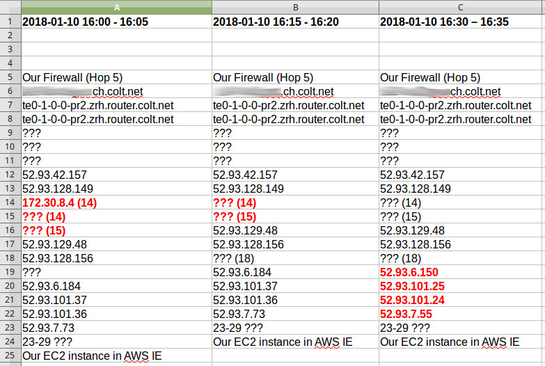 By comparing the hops side by side something interesting is revealed: There were indeed routing changes but only after the hop 52.93.128.156, which already belongs to AWS.