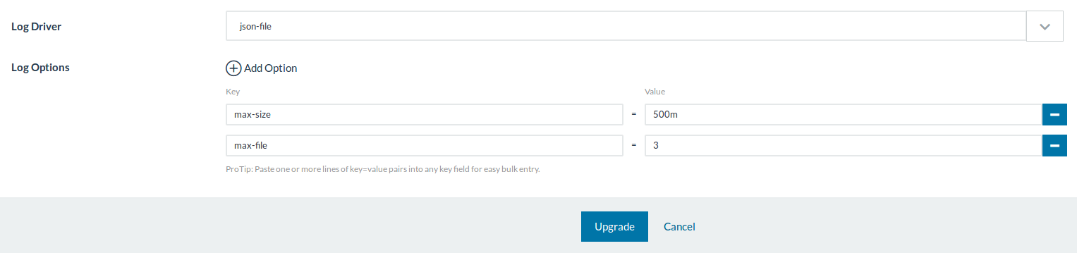 Because this Docker environment is managed by Rancher 1.x, the log settings need to be adjusted in the service which starts these containers. In Rancher the container names contain the service name: