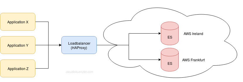 To suffer "less" from a failed Elasticsearch instance, we have set up two instances in two different regions (Elastic.co uses AWS in the background). The idea: Both Elasticsearch instances contain (more or less) the same data and we can balance or fail over from one to another instance. Using a load balancer (HAProxy) between the application and the two instances is self-explanatory.